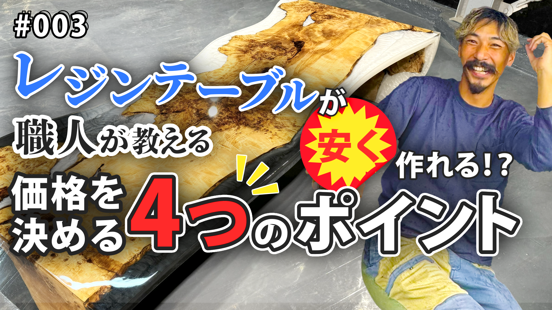 レジンテーブルって高いイメージがありますよね?できるだけ予算を抑えてかっこいいレジンテーブルを作るために、レジンテーブルの価格を決める4つの要素について樹代表の「ノリ」が解説しています。